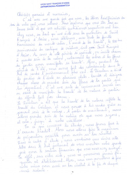 Jeśli chodzi o naukę, wkrótce będziemy musieli zmierzyć się z egzaminami… Zrobimy wszystko, co w naszej mocy, aby się dobrze do nich przygotować i uzyskać jak najlepsze rezultaty. Właśnie w czasie naszego przygotowywania się do egzaminu piszemy do Państwa ten list, aby przekazać Państwu naszą ogromną radość z pomocy finansowej, którą zechcieli Państwo nam przekazać. Istotnie bez tej pomocy nie moglibyśmy uczęszczać do szkoły, której obecnie jesteśmy uczniami. Dlatego obiecujemy Państwu, że dołożymy wszelkich starań, aby osiągnąć dobre rezultaty na koniec każdego roku szkolnego.