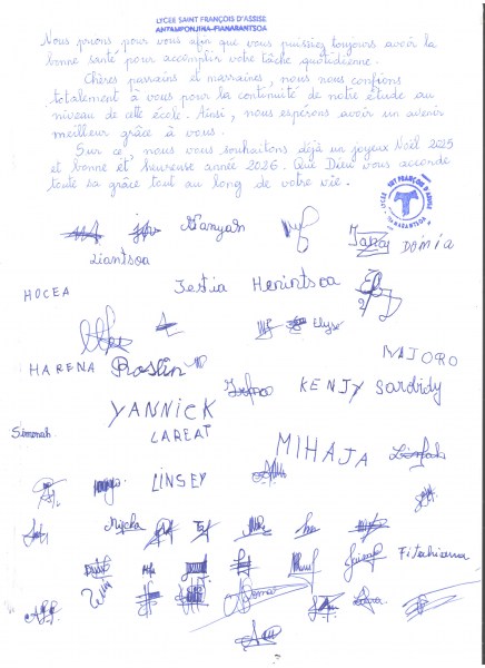 LIST UCZNIÓW Z LICEUM ŚW. FRANCISZKA Z ASYŻU W FIANARANTSOA