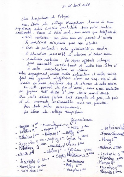 My, uczniowie Collège'u Mampitasoa, spieszymy wyrazić Państwu naszą wdzięczność za nieocenione wsparcie, którego Państwo nam udzielają. Dzięki Państwa pomocy mogliśmy w bieżącym roku szkolnym skorzystać z darmowych zeszytów, które otrzymaliśmy za pośrednictwem dyrekcji szkoły, kupionych za środki przekazane nam od Państwa, oraz z długopisów i innych przyborów szkolnych potrzebnych nam w nauce.